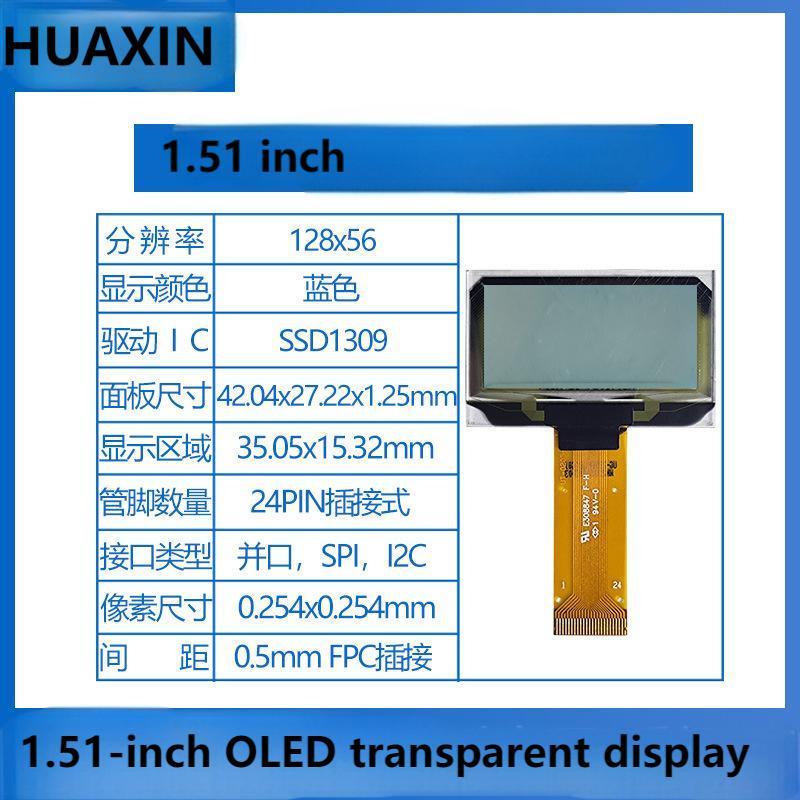 1,51-inch transparant OLED-scherm met een resolutie van 128×56, 24-pins plug-in interface. Ideaal voor slimme ramen, creatieve elektronica en zelfverlichtende transparante schermtoepassingen.